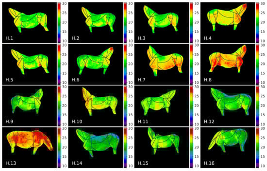 The visualization of thermal maps for horses in this study is presented in Figure 7 and for donkeys in Figure 8. As visual comparison of the images reveals that visible temperature patterns were more complex for horses, e.g.: average temperature values for horses H.8, H.13 were globally higher; GOR 8 Abdomen was visibly warmer for horses H.4, H.7, H.8, H.3; and GOR 4 Hindquarter was visibly warmer for horses H.4, H.7, H.8, H.10, H.13.