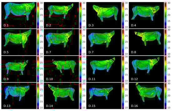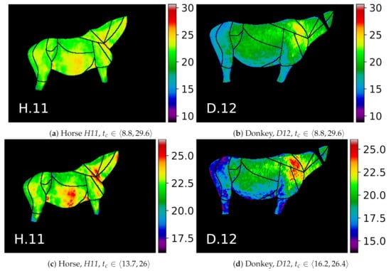 Unless stated otherwise, in all thermal map visualizations, the presented color map temperature values are limited to the common range of °C, which were extreme values in annotated ROIs for all animals included in the study (temperatures in ROIs: horses, °C, °C, donkeys, °C, °C), not including the animals D.17, D.18, for reasons explained in Section 2.1. Alternatively, values were selected as extreme temperature values in the ROIs for a given animal to highlight the features of visible thermal patterns; these special cases are clearly indicated.
