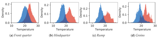 The donkey temperatures were more uniform. Temperature values in GOR 5 Rump were visibly lower than in other GORs, while in GOR 2 Front quarter, warm areas were observed. A comparison of the histograms for four selected GORs is presented in Figure 9, where it can be observed that the overlap between histograms is greater for GOR 2 than for GOR 5.