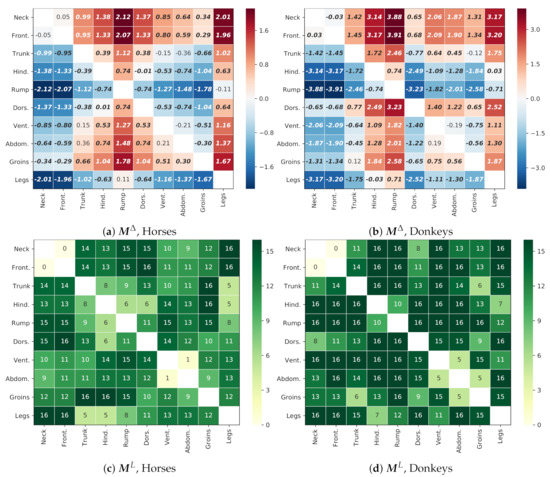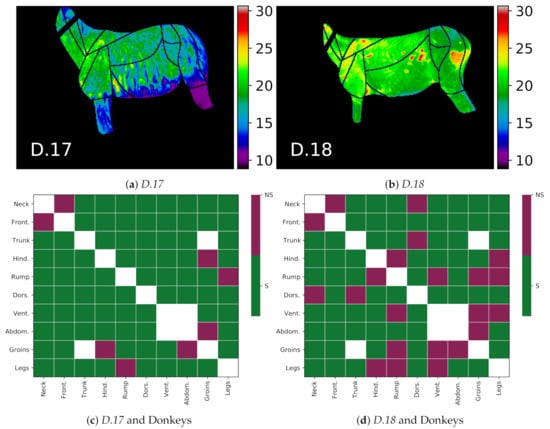 The two animals identified as outliers, i.e., D.17–18, allowed for an interesting study of how general or specific the proposed thermal patterns were. The visualization of the differences between the patterns of these animals and the rest of the donkeys is presented in Figure 13. In Panels b and c, the green color indicates the compliance of the animal thermal pattern with the global trend, i.e., the difference for a given pair of GORs has the same sign, and it is statistically significant () for the animal. Thermal patterns for the donkey D.17 with a thick hair coat were usually in line with the global pattern, except for four pairs of GORs, where the statistical significance of the local animal pattern could not be confirmed. The patterns of the donkey D.18 were much less in line with the global pattern. This was an expected result, as the patchy hair losses visibly affected its thermal characteristics in the image. This also suggests that the proposed thermal patterns may be the basis for creating temperature indexes, as, e.g., in [2], or features for detecting anomalies. The temperature difference matrices for these two animals are provided in Figure A2 in Appendix A.