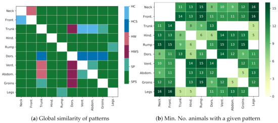 A summary of the pattern similarities between both species is presented in Figure 12. Figure 12a presents patterns that are similar for both species, e.g., the relation in temperatures between GORs Rump and Neck was the same for both species (the GOR 5 Rump was colder than the GOR 1 Neck), and this relation was globally, statistically significant (), which is indicated with the green color (the similar and globally statistically significant (SPS) class) in the image. Figure 12b presents the minimal number of animals in each species that shared the corresponding pattern, e.g., for the pair Rump and Neck, there existed at least 15 horses and 15 donkeys for which the pattern was also locally, statistically significant (). The majority of patterns fell under the SPS class, which supports the thesis about the similarities in the patterns for both species. In addition, the dissimilar patterns were most common in GOR 6 Dorsal aspect and GOR 3 Trunk.
