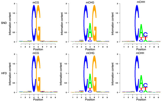 Genome-wide characteristics of methylated C bases. Sequence characteristics of bases near mCG, mCHG, and mCHH in the SND and HFD group.