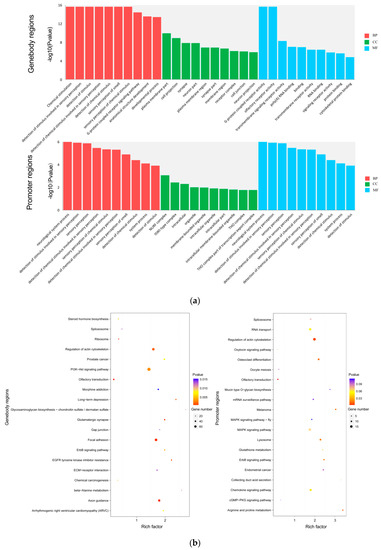 GO and KEGG enrichment analysis. (a) GO analysis of the overlapping DMRs-associated genes in the gene body regions and promoter regions. (b) KEGG pathway analysis of the overlapping DMRs-associated genes in the gene body regions and promoter regions. Rich factor = (DMRs-associated genes annotation in term/genes annotation in term)/(DMRs-associated genes with KEGG annotation / all genes with KEGG annotation).
