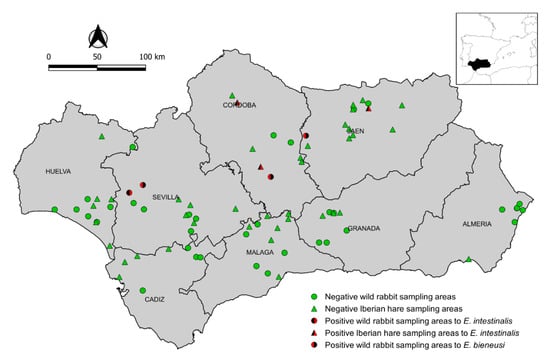 A cross-sectional study was carried out on wild lagomorphs in Andalusia (southern Spain) (36° N–38°60′ N, 1°75′ W–7°25′ W, 87,268 km2) between July 2015 and December 2018. The sample size for wild rabbits was calculated assuming a prevalence of 50% (the highest sample size for studies with unknown prevalence) with a 95% confidence level (95% CI) and a desired precision of ±5% [], which gave 384 wild rabbits to be sampled. Whenever possible, a minimum of 49 animals were sampled in each of the eight provinces of Andalusia in order to detect microsporidia infection with a 95% probability and an assumed minimum within-province prevalence of 6%. Kidney samples were collected from 383 wild rabbits in 40 hunting areas (Figure 1). In the same study region and period, kidney and brain samples were also obtained from 79 Iberian hares in 43 hunting or protected areas (Figure 1). Sampled animals were necropsied in the field. Samples were placed in sterile bottles (25 mL), preserved at 4 °C while transported to the laboratory, and stored at −20 °C until analysis. Data on species, age, gender, sampling site, province, and sampling year were gathered from each wild lagomorph sampled, whenever possible. Data analyses were carried out using the SPSS statistical software package version 25.0 (IBM Corporation, Somers, NY, USA).