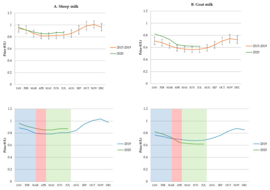Monthly prices for goat and sheep milk (2015–2020) were provided by InLac (the Spanish Interprofessional Dairy Organization (Interprofesional Lechera de España)), recognized by the Ministry of Agriculture, Fisheries and Food. InLac groups the Spanish dairy sector, whose members represent all the production branch, producers, processors, cooperatives and industries [23]. Briefly, data by InLac were used to describe the intra- and inter-annual price variation of the previous 5 years, as well as the price fluctuation in 2020.