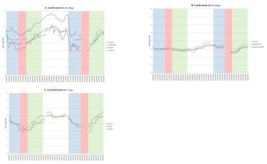 Prices recorded during the study were also different according to the geographical area and type of product. Sometimes, these differences were up to 1 EUR/kg for the same weight and week depending on the agrarian markets (Figure 2A). In this sense, taking into account the three types of product analyzed, the weekly prices of 10–12 kg lambs tended to fluctuate much more than lambs from 19 to 25 kg live weight (Figure 2A,B); price differences among markets were suggested to be higher for lighter lambs. The price of goat kid meat followed a similar trend to that of light lamb, although the price fluctuation seemed smaller (Figure 2C).