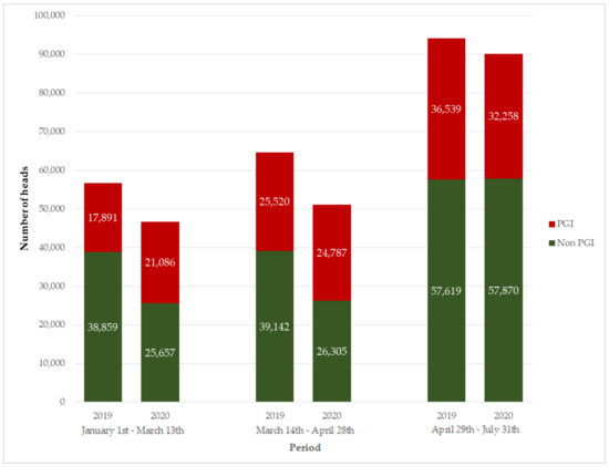 The absolute number of lambs sold during the period of study was 13% lower in 2020 than in 2019, with a more marked fall in the non-PGI vs. PGI lambs (−19% vs. −2%) (Figure 3). Analyzing each period, the pre-COVID-19 sales in 2020 (1 January–13 March) decreased compared to the same period in 2019 (18%). However, sales of non-PGI lambs fell by 34% compared to PGI lambs, which showed an increase of 18% (Figure 3). During the confinement period (14 March–28 April), the fall reached 21%, focused again on the non-PGI lambs (−33% vs. −3% for PGI lambs). Finally, the post-confinement period showed a drop in sales of 4%, partially compensated by higher sales of non-PGI lambs (29 April–31 July).