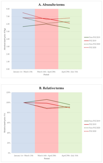 Evolution of average price by non-PGI and PGI lambs in 2019–2020 in Spain (PGI: protected geographical indication), in absolute (EUR/kg) (A) and relative (%) (B) terms. Relative prices are expressed as a percentage in relation to the initial period prices of every year. Blue, red and green shaded area corresponds to the period from 1 January to 13 March (pre-COVID-19), from 14 March to 28 April (total confinement), and from 29 April to 31 July (post-confinement), respectively.