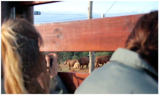 As WRC’s goal, beyond wildlife rehabilitation, is education, guests can visit the facility and learn about African wildlife conservation. The visitors include both tourists visiting the reserve and students from nearby schools and locals. It should be emphasized that no visitor–animal contact nor animal petting is allowed. Special covers are placed on the fence around all enclosures, so that the animals staying in the WRC do not have eye contact with visiting guests. Through the gaps located on the observation platforms, the animals can only see fragments of the faces of the observers (Figure 1). This allows visitors to observe different species without disturbing them, unlike in zoos where visitors can view animals from different angles [25]. Sight is not the strongest sense in rhinos, as opposed to olfactory and hearing abilities, which are both very acute. That is why such fence construction does not really apply for this species as an awareness of human presence, but it still provides more intimacy for the animals