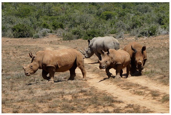 - Emslie, R.; Adcock, K. A conservation assessment of Ceratotherium simum simum. In The Red List of Mammals of South Africa, Lesotho and Swaziland; Child, M.F., Roxburgh, L., Do Linh San, E., Raimondo, D., Davies-Mostert, H.T., Eds.; South African National Biodiversity Institute and Endangered Wildlife Trust: Pretoria, South Africa, 2016; Available online: https://www.ewt.org.za/wp-content/uploads/2019/02/1.-Southern-White-Rhinoceros-Ceratotherium-simum-simum_NT.pdf (accessed on 26 March 2020).