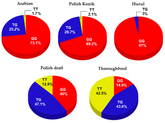 Genotyping analysis of alleles across five horse breeds indicated a few significant differences among the breeds. The highest percentages of the TG (c.238TG) genotype were detected in Polish draft horses and TB populations (47.1% and 43.6, respectively), and the lowest TT (c.238TT) individuals occurred in Arabian horses and Polish Konik. In the Hucul breed, the TT genotype was not present, and GG (c.238GG) horses accounted for 97%. Genotype distribution was significantly distinct among the investigated horse breeds (Table 2). The highest number of TT individuals was identified in the TB breed (41.5%), a result that was significant compared to those of the other breeds (Table 3 and Figure 1). The TB population exhibited similar frequency for both the TG and the TT genotype (43.6% and 42.5%, respectively), while the Hucul breed was almost monomorphic. Moreover, all investigated horse populations were consistent with the Hardy–Weinberg equilibrium (Table 3 and Figure 1).