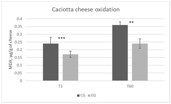 Lipid peroxidation profile of cheese samples obtained from the control group (CG) and the experimental group (EG). Analysis performed on samples obtained after 1 (T1) and 60 (T60) d of ripening. MDA = malondialdehyde; ** p < 0.01; *** p < 0.001.