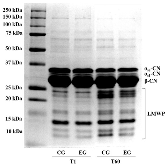Results of SDS-PAGE analysis of protein in cheeses at 1 (T1) and 60 (T60) d of ripening from goats fed a standard diet (CG) or diet supplemented with olive leaves (EG). α-CN: α-casein; β-CN: β-casein; LMWP: low molecular weight protein.