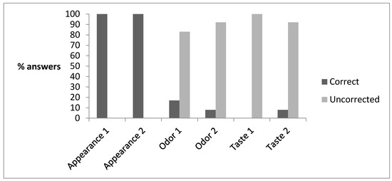 Results of the paired comparison tests in terms of % of correct and uncorrected answers (2 replicates) in the discrimination of samples with regard to the parameters reported on the abscissa axis (appearance, odor, and taste). The dark colored columns represent the percentage of correct answers, while the percentage of uncorrected answers is represented by light colored bars.
