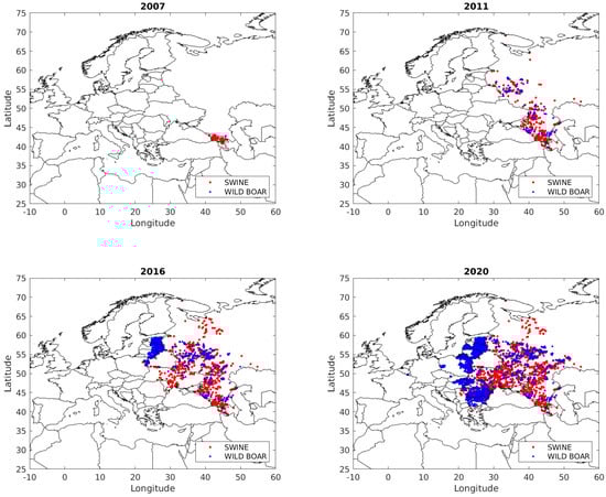 Since 2007, ASF has spread through Eastern European countries even reaching Central and Western Europe. The first outbreak was reported in Georgia from where it rapidly spread to the Russian Federation (2007). Later, Ukraine (2012), Belarus (2013), Estonia, Lithuania, Latvia and Poland (all 2014) reported infection, mainly in wild boar populations. Then, six European countries became infected: Moldova (2016), Romania (2017), Czech Republic (2018), Hungary (2018), Bulgaria (2018), Belgium (2018) and Germany (2020), see Figure 1. It was reported in Asia for the first time in August 2018. Elsewhere, in China, which contains almost half of the world domestic pig population, the disease has spread very quickly with more than 100 outbreaks from 28 different provinces and around one million of domestic pigs have been culled []. Currently, Mongolia (2019) and Vietnam (2019) have reported ASF (OIE, www.oie.int). This situation highlights the great importance of early detection of ASF in order to control its spread.