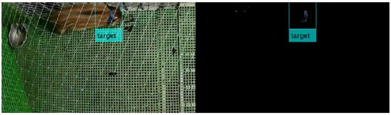 For this purpose, three consecutive processes are carried out. The first process consists on a binary image segmentation based on color threshold. In other words, pixels with similar RGB values to blue/orange are filtered in a single frame (see Figure 2, right). Thus, pixels from targeted collars are filtered. Then, most pixels associated to other color-based objects were discarded, except some residual pixels with similar color to blue/orange.
