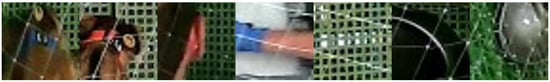 Samples of 227 × 227 × 3 pictures for training AlexNet. From left to right: orange collar, blue collar, ear of a veterinarian, a forearm, gridded ground and eating/drinking drinking troughs. All these objects show blue/orange connected pixels, then objects to be classified.