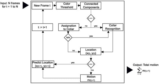 For two consecutive frames, at times and t, the centroid of the collar located on and , respectively, the motion is computed by the Euclidean distance: