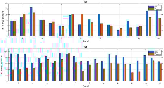 Figure 6 shows the total daily motion computed in both experiments (units of motion: pixels per frame). Blue/orange bars represented the total motion computed every day per each animal in E1, and the averaged motion of the animals within each group in E2.