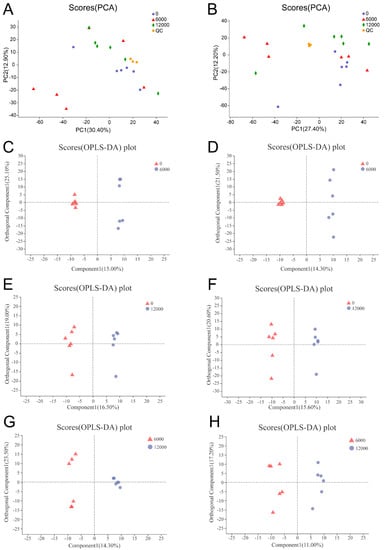 PCA scores plot of L. vannamei given 0, 6000 and 12,000 mg/kg dietary choline chloride: (A) ESI+ mode; (B) ESI− mode. QC is the abbreviation of quality control sample. OPLS-DA scores plot of L. vannamei in the three compared groups: (C) ESI+ and (D) ESI− modes of shrimp given 0 versus 6000 mg/kg choline; (E) ESI+ and (F) ESI− modes of shrimp given 0 versus 12,000 mg/kg choline; (G) ESI+ and (H) ESI− modes of shrimp given 6000 versus 12,000 mg/kg choline.