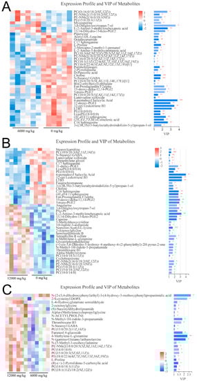 VIP values and expression levels of differential metabolites in the three compared groups: (A) 0 versus 6000 mg/kg; (B) 0 versus 12,000 mg/kg; (C) 6000 versus 12,000 mg/kg. * (p < 0.05), ** (p < 0.01) and *** (p < 0.001).