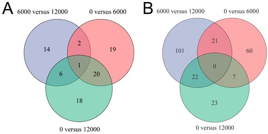 Venn diagram analysis among three compared groups: (A) differential metabolites; (B) differentially expressed genes.