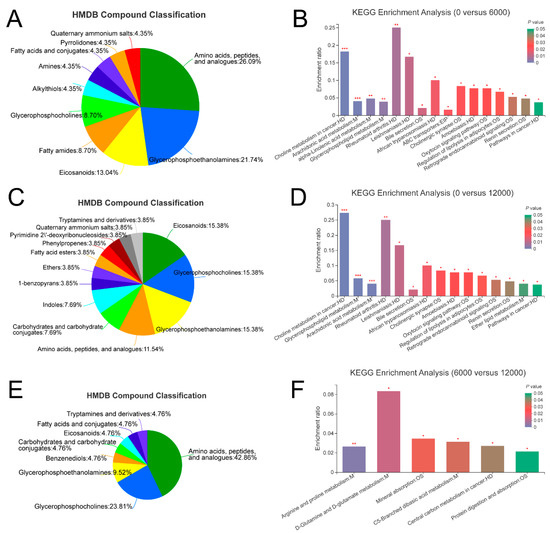 Classification of differential metabolites annotated to HMDB database in the three compared groups: (A) 0 versus 6000 mg/kg; (C) 0 versus 12,000 mg/kg; (E) 6000 versus 12,000 mg/kg. KEGG enrichment analysis based on differential metabolites in the three compared groups: (B) 0 versus 6000 mg/kg; (D) 0 versus 12,000 mg/kg; (F) 6000 versus 12,000 mg/kg. Levels of significance are defined as * (p < 0.05), ** (p < 0.01) and *** (p < 0.001).