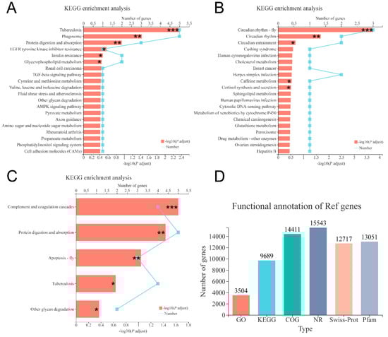 KEGG enrichment analysis based on DEGs in the three compared groups: (A) 0 versus 6000 mg/kg; (B) 0 versus 12,000 mg/kg; (C) 6000 versus 12,000 mg/kg. (D) Functional annotation information of genes obtained from six databases. Levels of significance are defined as * (p < 0.05), ** (p < 0.01) and *** (p < 0.001).