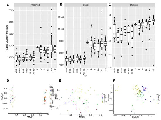 Changes in the microbiome biodiversity in the perinatal period. (A) Bacterial alpha diversity determined by the observed OTU index. (B) Bacterial alpha diversity determined by the Chao index. (C) Bacterial alpha diversity determined by the Shannon index. (D) Non-metric multidimensional scaling (NMDS) based on Bray–Curtis for all samples. (E) NMDS based on Bray–Curtis for the samples before birth. (F) NMDS based on Bray–Curtis for the samples after delivery.