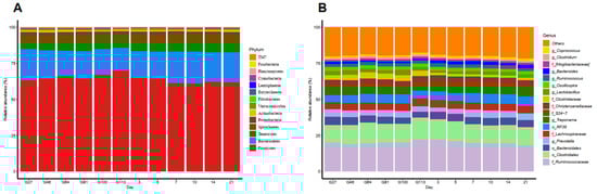 The bacterial composition in the perinatal sow feces samples determined by polymerase chain reaction amplification and 16S rRNA pyrophosphate sequencing. (A) The relative abundance of bacterial compositions at the phyla level of the bacteria in the feces sample. (B) The relative abundance of horizontal bacterial compositions at the genera level in fecal samples.