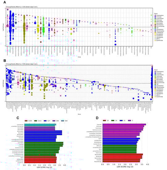 The results of biomarker analysis after delivery showed that the postpartum period was determined at 3, 10, 14, and 21 days of lactation. Types of microbiota observed on the third day after delivery were similar to those on the 113th day of pregnancy (Figure 3C) with Clostridiales, Ruminococcaceae, Clostridia, and unclassified Christensenellaceae having the enriched proportion. Bacteroides and Prevotella biomarkers were enriched on the 10th day after delivery. Mollicutes, Tenericutes, and RF39 were enriched on the 14th day after delivery, while Bacilli, Lactobacillales, Veillonellaceae, and Mollicutes were enriched on the 21st day after birth. The obtained results suggest that the microbiota changes constantly with the increase of the postpartum days.