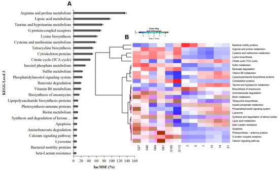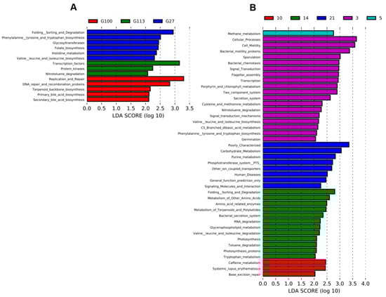 The Phylogenetic Investigation of Communities by Reconstruction of Unobserved States (PICRUSt) was predicted using the 16S rRNA-tagged gene sequence []. Phylogenetic studies were performed with regards to existing complete genomic sequences. OTUs were selected for the closed reference method of the Greengenes 13_8 reference database using the pick_closed_reference_otus.py script package of the QIIME software. The OTU table was then normalized based on the copy number of the 16S rRNA gene, and the metagenomics were predicted from the Kyoto Gene and Genomic Encyclopedia (KEGG) catalog. The LEfSe software was used to calculate the difference of the microbial composition and functions with the default LDA score being set to 2.0 and the Kruskal–Wallis and Wilcoxon detection significance thresholds set at 0.05 [].