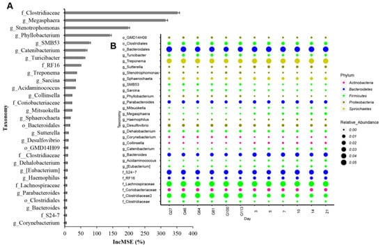 The important bacteria are identified by the machine learning algorithm random forest. (A) The top 29 bacteria during the perinatal period; (B) the distribution of the top 29 bacteria at different time points. IncMSE means increased in mean squared error.