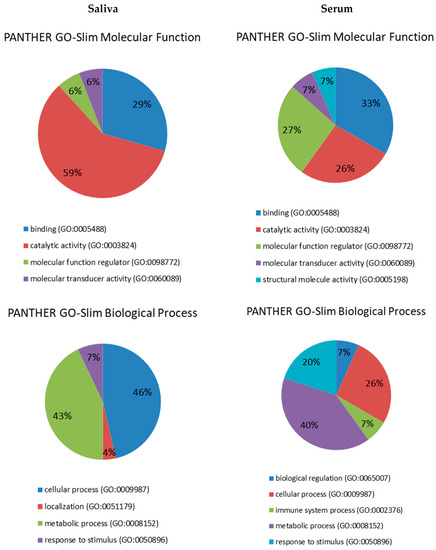 The present study demonstrates, for the first time, changes occurring in saliva and serum proteomes in dogs with diabetes mellitus. Almost twice proteins were identified in saliva compared to serum, which was in concordance with other studies [22]. None of the proteins differentially modulated in DM appeared in both serum and saliva and data about molecular function, biological process, pathways or protein class was different between the two biofluids. These findings were consistent with previous works in which matched saliva and serum samples were used [23]. Therefore, both biofluids present complementary information and may have diagnostic potential for DM.