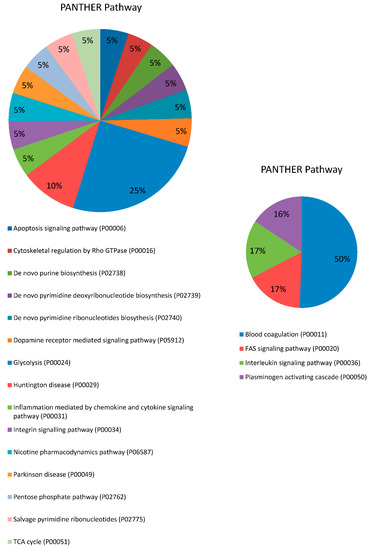 Of the 16 unique proteins differently modulated between HC and DM groups, 13 were down-regulated and three were up-regulated in DM. The proteins differently expressed in serum between HC and DM groups were used for subsequent bioinformatics analyses in terms of functional clusters, according to the PANTHER classification system, as shown in Figure 1.