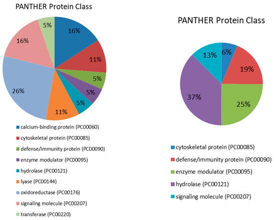 Proteins were distributed within five different molecular functions: binding (GO:0005488) (33.3%), catalytic activity (GO:0003824) (26.7%), molecular function regulator (GO:0098772) (26.7%), molecular transducer activity (GO:0060089) (6.7%) and structural molecule activity (GO:0005198) (6.7%). They participate in five molecular processes, namely metabolic process (GO:0008152) (40%), cellular process (GO:0009987) (26.7%), response to stimulus (GO:0050896) (20%), immune system process (GO:0002376) (6.7% pl) and biological regulation (GO:0065007) (6.7%). Four pathways were found to be related to those differentially expressed proteins: blood coagulation (P00011) (42.9%), FAS signaling pathway (P00020) (14.3%), interleukin signaling pathway (P00036) (14.3%) and plasminogen activating cascade (P00050) (13.3%). Lastly, five proteins classes were identified, being hydrolase (PC00121) the most represented (37.5%), followed by enzyme modulator (PC00095) (25%), defense/immunity protein (PC00090) (18.7%), signaling molecule (PC00207) (12.5%) and cytoskeletal protein (PC00085) (6.3%).