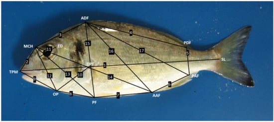 A ruler was included in each fish photograph in order to guarantee a correct calibration in the further image processing carried out by using ImageJ software (National Institutes of Health, Bethesda, MA, USA). A set of 17 different morphological measures was established to generate a box-trust network that enabled a precise definition of fish morphology [], using 9 different landmarks (Figure 1). The variability in the image calibration among fish was always lower than 0.5%.