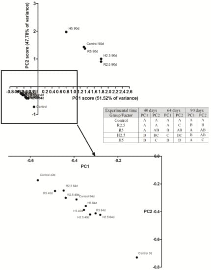Scatter plot of the mean values of PC1 (isometric size) and PC2 (allometric shape) accordingly with the PCA analysis for the different experimental groups after 0, 40, 64 and 90 days of treatment with a diet containing 2.5 or 5% of raw (R2.5 and R5, respectively) or hydrolyzed (H2.5 or H5, respectively) microalgae biomass or a diet without microalgae biomass (Control). Statistical analysis was performed by two-way ANOVA followed by Duncan’s post-hoc analysis. Inset: Different letters indicate significant differences (p < 0.05) among groups.