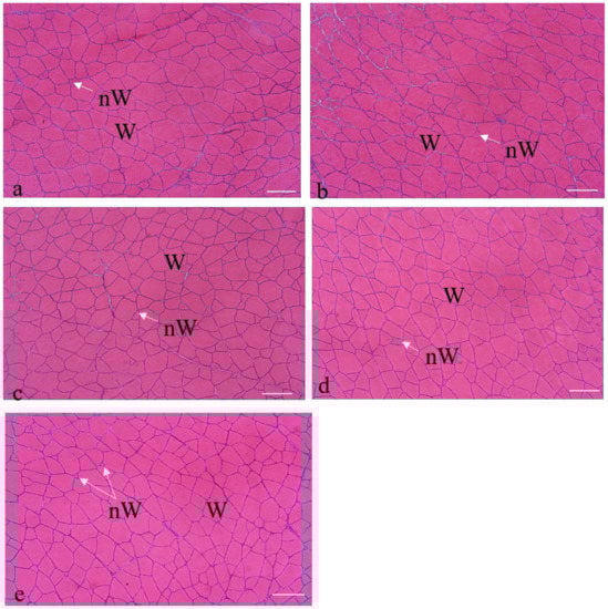 Transverse sections of the white muscle of gilthead seabream specimens fed C (a); R2.5 (b); R5 (c); H2.5 (d); and H5 (e) diets. Hematoxylin-eosin staining. W: white muscle fibers; nW: new white muscle fibers. Bars 500 µm.