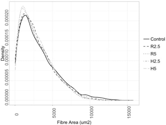 On the other hand, the fibers area distribution showed overlapping profiles between fish of the control group and those with the lowest microalgae inclusion in the diets (R2.5 and H2.5; Figure 4). Fish that had been fed with the highest microalgae inclusion level (R5 and H5) showed higher proportion of fibers size between 200 and 1200 µm2 than the other groups (Figure 3), which was parallel to higher values of fibrillar density in these groups than in C and R2.5 (Table 10).