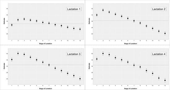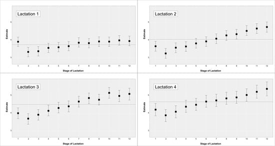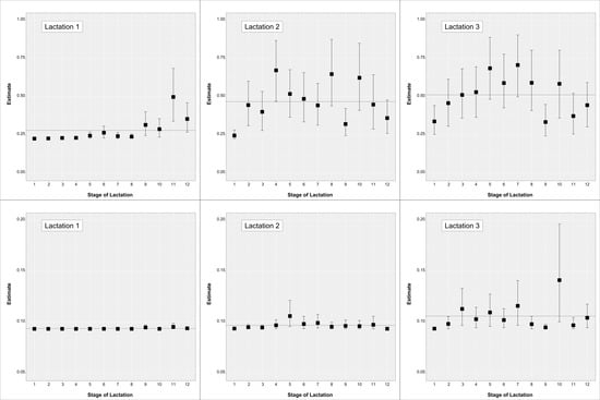 Estimates for TSa in lactation 1 showed an increase in the higher scores towards the end of lactation with estimates going from below 0.25 to 0.30. Values similar to the end of lactation 1 were maintained in lactation 2 and subsequently, suggesting that the deterioration of teats is carried over (it is worth considering that this is a cross-sectional study, and not a longitudinal study). Estimates within lactations 2 and subsequently did not show as clear a pattern, though a small increase was shown until the peak of lactation. Lactation estimates across stages for TSa increased from 0.28 to 0.47 to 0.51 in lactation 1, 2 and 3, respectively. Similarly, lactation estimates across stages for TSb increased from 0.094 to 0.097 to 0.106 for lactation 1, 2 and subsequently. Conversely, estimates within-lactation for TSb did not show relevant differences.