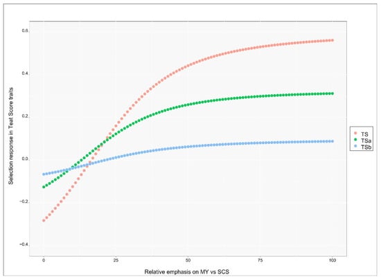 The genetic response in teat score traits (TS, TSa and TSb) after selecting for both MY and SCS applying different relative emphasis is reported in Figure 4. The x-axis gives, from left to right, the relative emphasis as shifting from MY to SCS, the y-axis gives the genetic response in genetic standard deviation units for the respective trait given the overall relative emphasis. The values on the left side of the graph show the response when low emphasis is given to MY, which is positively (unfavorably) correlated with the three traits, and high emphasis is given to SCS, which is still positively correlated but it was given negative emphasis.
