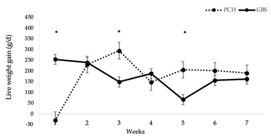 Similar average LWG values were found between swards, but a significant interaction (p < 0.05) was detected with week (Figure 2), with a slight weight loss in the first week and a higher gain (p < 0.05) in the third and fifth weeks for PCH, compared to GBS.