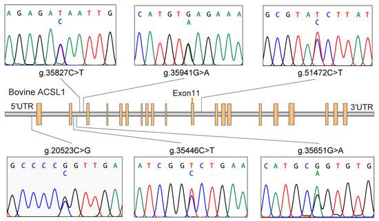 Primers used for SNP identification within ACSL1 were designed by Designer software package (Primer Premier 5, PP5, Premier, Ottawa, Canada) according to the sequence provided in GenBank (accession No. NC_037354). PCR temperature gradient was determined by an optimal annealing temperature, (Table 1) and PCR reaction was carried out in a PTC-200 DNA Engine cycler (Bio-Rad, Big Sur, CA, USA). Twenty samples were randomly selected from 992 cow DNA samples to screen for the SNP site and its location. The primer and PCR amplification procedures (total size of the amplification was 8544 bp) were used to amplify the sequence of the selected sites. Finally, 8544 bp of 64,883 bp of the ACSL1 gene were genotyped. The amplification effect was detected by agarose gel electrophoresis and then sequenced by the Shanghai Sangon Company (Shanghai, China). Three software programs, SeqMan (Invitrogen, Carlsbad, CA, USA), SnapGene Viewer (Invitrogen, Carlsbad, CA, USA), and Vector NTI (Invitrogen, Carlsbad, CA, USA), were then used to analyze the sequences and to find the mutation sites and its location. After discovery of the SNP sites, all samples (992, including the previous 20 samples) were genotype by using the MassARRAy system (Sequenom Inc., San Diego, CA, USA). At the same time, twenty samples were repeated twice (the tester did not know that these twenty samples were repeated) in order to ensure the reliability of SNP analysis results. The results showed the accuracy of SNP genotyping to be 100%.