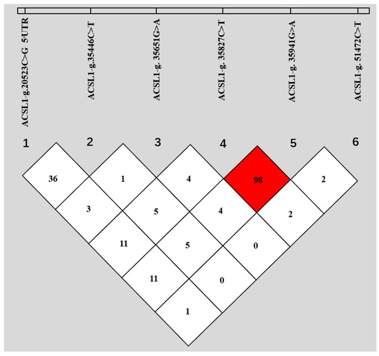 Linkage disequilibrium (LD) among the six SNPs of bovine ACSL1. The values in boxes are pairwise SNP correlations (r2), and the bright red box indicates approximate complete LD (r2 = 1).