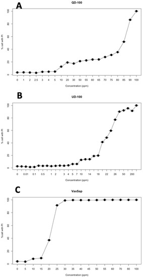 Cytotoxicity curves of quillaja extracts on SHK-1 cell culture: (A) QD 100; (B) UD100-Q; (C) VaxSap.