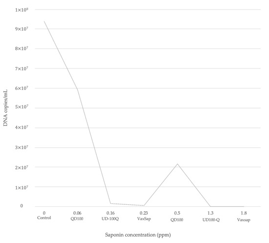 Saponins rich products such as Vax Sap and UD100-Q had a potential of reduction in infection by 10- and 1000-fold, respectively (Table 2). The level of reduction fold was saponin concentration-dependent (Figure 2), with lower P. salmonis DNA concentrations post-infection when the cells were treated with a high concentration of saponins (Table 2, Figure 2). However, QD100 product showed a lower protective effect in comparison with UD100-Q and VaxSap (37.13% vs. 98.29% vs. 99.48%, respectively). Cells pre-treated with 0.5 ppm of saponins from QD100 showed a DNA concentration of P. salmonis to 2.2 × 107 DNA copies/mL, very similar to the control group. On the other hand, when cells were pre-treated with 0.23 ppm of saponins from Vax Sap, DNA concentration of P. salmonis was reduced to 2.4 × 103 DNA copies/mL (Table 2, Figure 2), These results suggest that saponin concentration and extract purification could be involved in the observed effect.