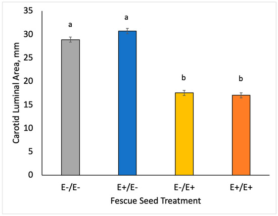Figure 2. Carotid luminal area was measured on d 123 ± 7 in ewes fed E− or E+ fescue seed from d 35 to 85 and/or d 85 to parturition. a,b Superscripts denote differences (p < 0.05).