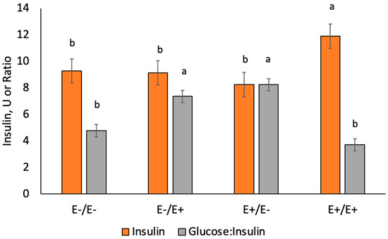 Figure 4. Average plasma insulin (U) concentrations and glucose to insulin ratio during gestation for ewes fed E− or E+ seed. Superscripts denote significance (a,b p < 0.05) by variable.