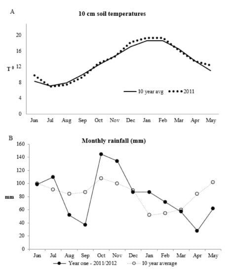 (A) Soil temperature (°C) and (B) rainfall (mm) at the experimental site for 2011 and the 10 year average.